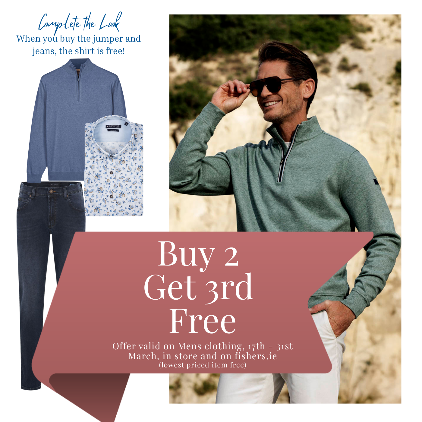 valid on all Mens new and sale clothing, lowest priced item free